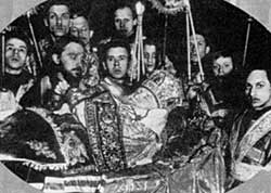 Сам Святейший Патриарх Тихон умер в марте (25марта/7 апреля) 1925 года и отпевание его совершалось в Донском монастыре, где тело стояло четыре дня. Отпевание совершал митрополит Крутицкий и Коломенский Петр в сослужении шестидесяти двух архиереев. Духовенства в соборе было так много, что народ не мог уже туда поместиться...