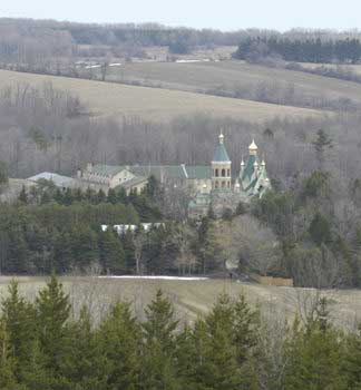 На двух машинах серебристого цвета мы проехали мимо имения Растроповича и Вишневской, поднялись на взгорье и подъехали к кресту. И увидели такой вот весенний вид монастыря и его окрестностей: