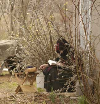 Пропели тропарь кресту, вспомнили историю монастыря. Потом посетили женскую общину Святой Елизаветы Феодоровны и случайно увидели схимницу Марию. Она молилась по четкам, и кажется еще читала Псалтирь. Незаметно сфотографировали (очень красиво получилась она среди цветущих верб в Вербное Воскресение):