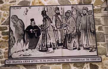 Русский Свято-Пантелеимонов монастырь с его сияющими на солнце куполами и маковками, позолоченными шарами и разновысокими крестами среди пальм и кипарисов создает у прибывающих на Святую Гору Афон паломников величественно-праздничное настроение. С монастырской пристани на территорию самой Обители можно попасть только через Великие монастырские ворота, устроенные в толще южной стены. Главный вход, именуемый по афонской традиции "порта", обрамлен куполообразной сенью, опирающейся на две мраморные колонны. Над аркой самого входа, в нише - величественный образ небесного покровителя русской обители - св. великомученика и целителя Пантелеимона, чьи цельбоносные мощи находятся в главном соборе на монастырской площади. Слева на стене у Великих ворот висит большая каменная плита из лабрадора с черно-белыми силуэтами Богородицы, монахов и странников. Мемориальная плита на русском и греческом языках рассказывает о дивном чуде явления Божией Матери, произошедшем на этом месте ровно сто лет назад - 21 августа / 3 сентября 1903 года. Само изображение на каменной плите является увеличенной копией старой фотографии, запечатлевшей чудо, когда Божия Матерь явила в монастыре черты Своего Святейшего Облика, как сказал один из старых монахов , " в утешение и подтверждение Своего Промышления о нас грешных".