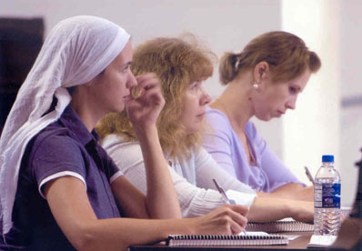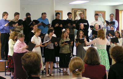 Пожалуй самый главный предмет в школе регентов - хоровое пение и хороведение. Пели мы и дирижировали не покладая рук и голосов под руководством нашего дорогого и всеми любимого педагога Николая Алексеевича Мышкина. Он прилетел в Джорданвилль из самой Москвы. Церковно-славянский язык песнопений не всем даётся легко, но особенно труден он американцам. Ведь для них и русский-то не родной. Николай Алексеевич старается помочь изо всех сил, а заодно учит произносить правильно и собственную фамилию: "Да не Ми-И-шкин я, а Мы-Ы-шкин. "Он не только учит руководству хором, но и развивает музыкальный вкус студентов. С сожалением говорит, что постепенно церковная музыка засоряется произведениями высокого уровня с музыкальной точки зрения, но далёкими от истинного православного смысла. Такая музыка отходит от основных традиций древне-русских распевов. О других традициях, на этот раз итальянской оперной школы, заботится другой наш педагог - Анатолий Иванович Панчёшный. Он обучает нас вокальному искусству и объясняет, что пение в церкви, это дело ответственное перед Богом, поэтому "абы как" (попробуй переведи такое выражение американцам!) тут звук издавать нельзя, а только с полным знанием дела, сознательно.